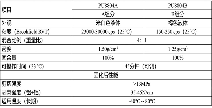 雙組分無(wú)溶劑聚氨酯粘合劑PU8804,用于鋁蜂窩板的粘結(jié),為高性能版本,各項(xiàng)性能指標(biāo)超越進(jìn)口同類產(chǎn)品。也可用于金屬、石材、鋁蜂窩板、巖棉板、冷庫(kù)、建筑、船舶、機(jī)車電子粘接,例如聚苯板、XPS擠塑板與硅酸鈣板、鋼板、鋁板、外墻地坪的粘接。產(chǎn)品符合歐盟ROHS,GB/T-18583-2008等有害測(cè)試標(biāo)準(zhǔn)。